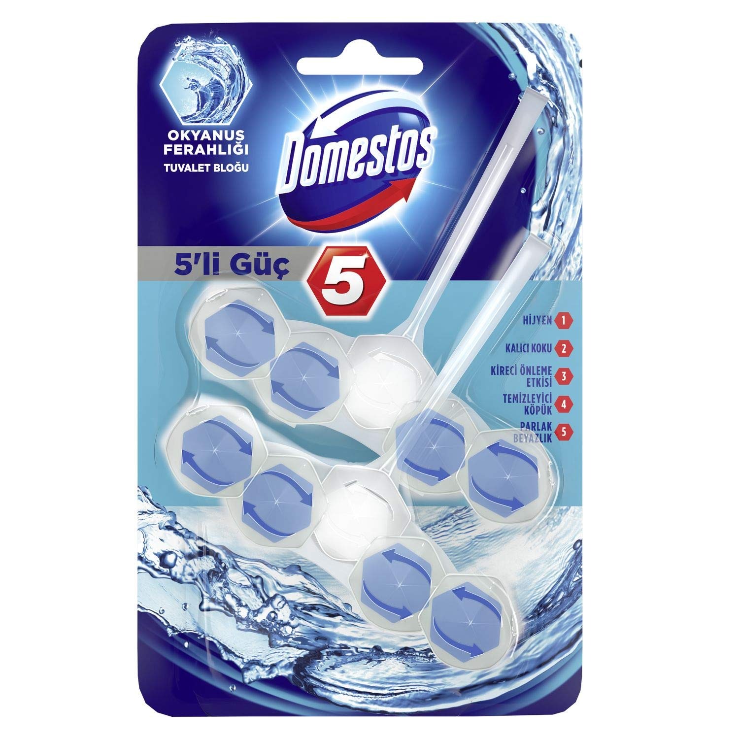 Domestos WC Block 5-Li Power Ocean is designed to ensure optimal cleanliness and hygiene in your toilet with each flush, benefiting both you and your family through its five powerful features. These include hygiene enhancement, long-lasting odor control, anti-lime properties, cleaning foam, and brilliant whiteness. Now is the perfect moment to utilize a toilet block for a refreshing fragrance, a sparkling shine, and superior hygiene in your bathroom.