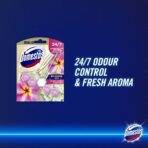 The Domestos Aroma Lux Pink Jasmine & Elderflower Toilet Block is a premium-scented toilet freshener from the leading toilet cleaner brand in the UK. Infused with essential oils, this toilet rim block effectively minimizes unpleasant odors while continuously releasing a delightful fragrance in your restroom. With each flush, it generates a rich foam that aids in preventing limescale buildup, eliminating grime, and ensuring your toilet bowls remain hygienically gleaming with a long-lasting scent. The exquisite floral aroma of pink jasmine and elderflower keeps your toilet smelling fresh for an extended period. Additionally, this toilet rim block is offered in another distinctive fragrance, White Rose & Tea Tree Oil. To use, simply unfold the hanger, break the plastic lock, and position it over the toilet rim, making sure it is positioned in the water flow. After removing the product from its packaging, please dispose of any leftover material responsibly. Remember to wash your hands thoroughly after handling. The Domestos Aroma Lux Toilet Block is packaged in 100% recycled blister and cardboard materials. Domestos remains committed to safeguarding millions of families with its wide array of cleaning solutions, including multi-purpose wipes, thick bleach, and bleach sprays. Domestos bleach products can also serve as versatile cleaners throughout your home, including in the bathroom. Nielsen, Total Market MAT, Toilet Cleaning, January 2021