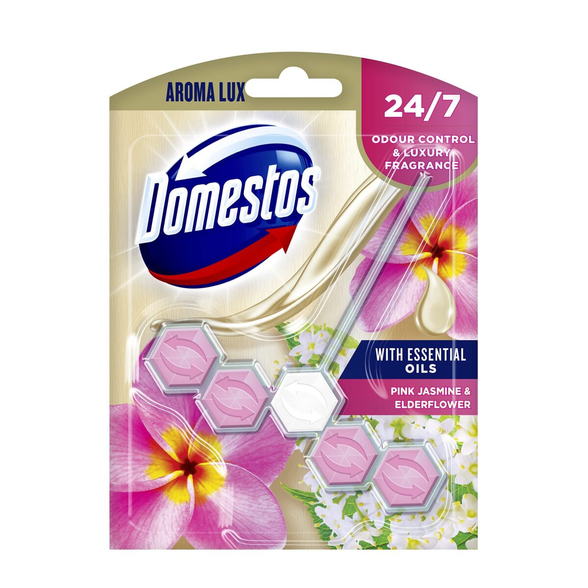 - Domestos Aroma Lux Pink Jasmine & Elderflower Toilet Block offers round-the-clock odour protection infused with essential oils.