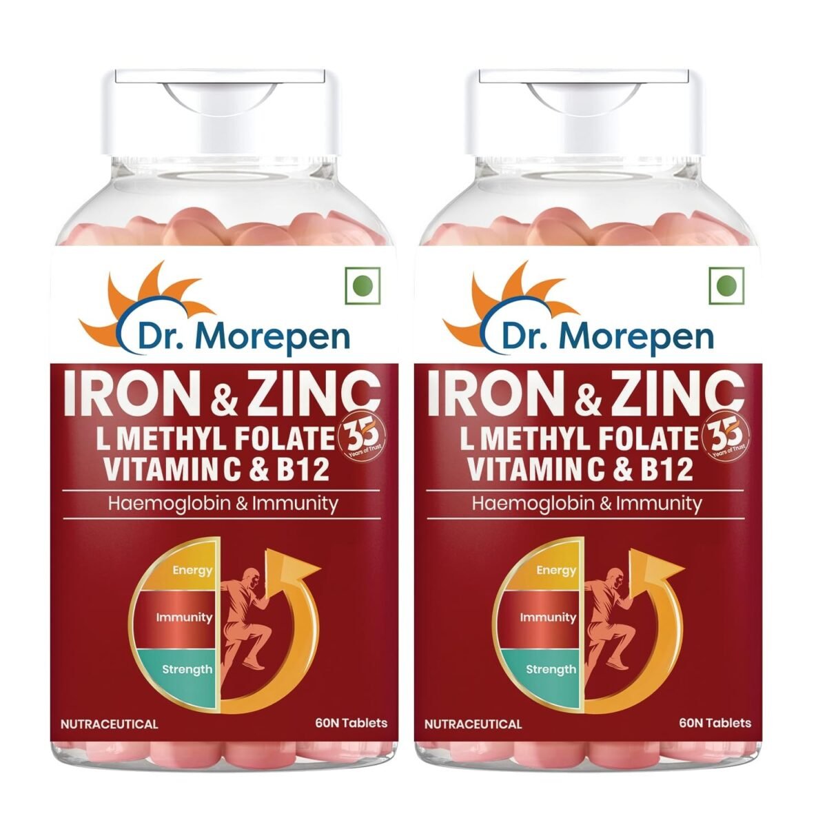 Dr. Morepen Iron & Zinc Tablets|Enriched with Iron,Zinc,Vitamin C & B12|Natural & Safe for Unisex|60 Veg Tablets (Pack of 2), 500 grams – Fast Shipping to USA