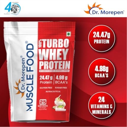 Dr. Morepen Muscle Food Turbo Whey Protein Powder Kesar Pista Kaju Flavor – 1kg | Ultimate Lean Muscle Building Formula, Increase Strength & Performance | 24.7g Protein 4.98g BCAA Gluten & Sugar Free – Fast Shipping to USA