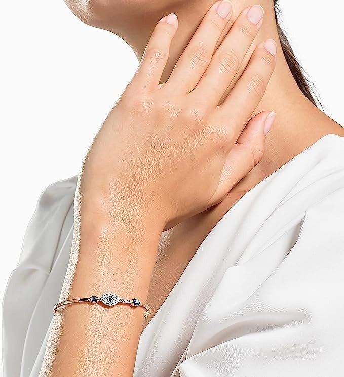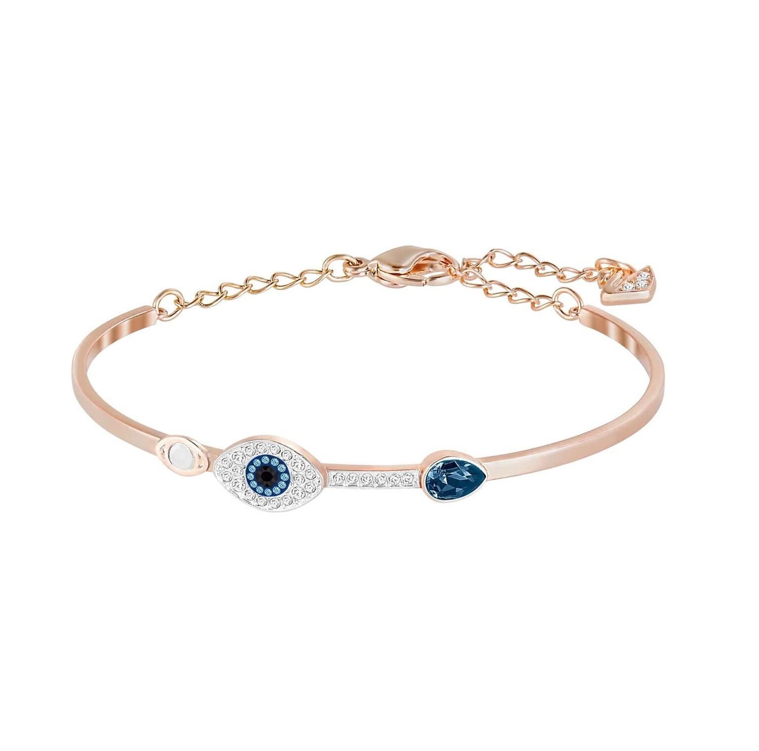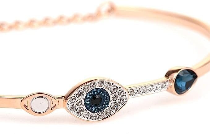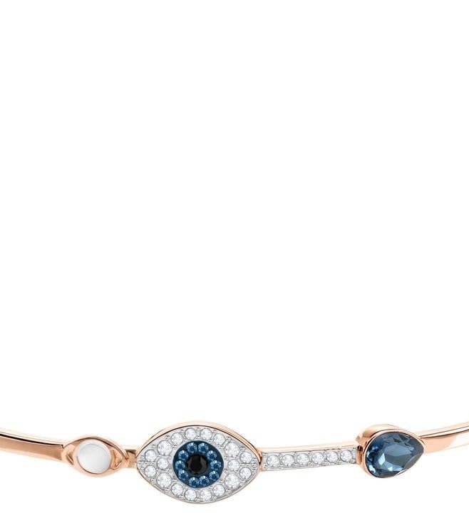 This exquisite mixed-metal bangle showcases a captivating interplay of rose gold plating, crystal pav?, and blue gemstones. Adorned with two eye motifs and a blue crystal drop, it features an adjustable clasp for a comfortable fit. Pair it with other bangles for a fashionable ensemble.