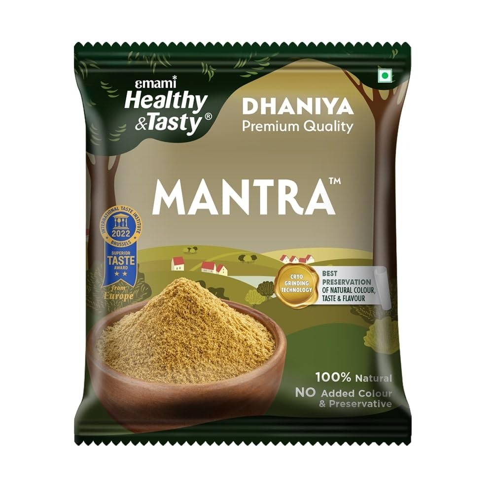 With a delightful hint of sweetness and a taste reminiscent of a fresh garden. Mantra?s 100% natural Dhaniya powder infuses your dishes with a distinctive freshness, flavor, and aroma. Sourced from premium, hand-selected coriander seeds, this coriander powder is devoid of preservatives and artificial colors. Utilizing CRYOGENIC GRINDING TECHNOLOGY, Mantra Masala from Emami Healthy & Tasty ensures that the essential oils and aromas of the spices are preserved, allowing you to enjoy their full benefits and flavors. Adhering to the highest quality standards, these spices are produced in a state-of-the-art, fully automated facility. Mantra is committed to providing spices that impart an authentic taste and rich flavors to all your culinary creations. Additionally, Mantra Masala has received recognition from the International Taste Institute in Europe for its exceptional taste and quality.
