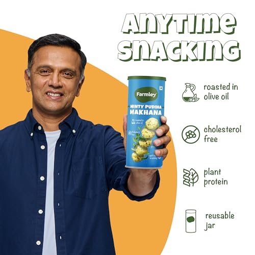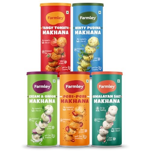 **Farmley Peri Peri Roasted Makhana in Olive Oil, Healthy & Crunchy Snacks 83g** Makhana, commonly known as fox nuts or lotus seeds, is a unique delicacy from India, renowned for its delightful flavor. These snacks are particularly favored during fasting periods. They serve as an ideal option to quell mid-meal cravings while offering numerous health advantages.**Farmley Himalayan Salted Roasted Makhana in Olive Oil, Healthy & Crunchy Snacks 83g** Makhana, often referred to as fox nuts or lotus seeds, is a distinctive Indian product celebrated for its exquisite taste. They are highly sought after during fasting. These snacks are perfect for curbing mid-meal hunger while providing health benefits. Farmley delivers top-quality makhana, hygienically packaged and conveniently brought to your doorstep for your enjoyment.**Farmley Cream & Onion Roasted Makhana in Olive Oil, Healthy & Crunchy Snacks 83g** Makhana, also known as fox nuts or lotus seeds, is a specialty from India, cherished for its exceptional flavor. They are especially popular during fasting. These snacks are the perfect solution for mid-meal hunger pangs while also offering health benefits. Farmley presents the finest quality makhana, carefully packed and delivered right to your door for your pleasure.**Farmley Minty Pudina Roasted Makhana in Olive Oil, Healthy & Crunchy Snacks 83g** Makhana, referred to as fox nuts or lotus seeds, is a unique Indian delicacy known for its delightful taste. They are particularly favored during fasting. These snacks are an excellent choice for satisfying mid-meal cravings while providing health benefits. Farmley offers premium quality makhana, hygienically packaged and conveniently delivered to your doorstep for your enjoyment.**Farmley Roasted Makhana, Tangy Tomato Flavored | 83g | Healthy Makhana Roasted in Olive Oil, Healthy Snacking (Pack of 1)** Makhana, also called fox nuts or lotus seeds, is a distinctive product from India, celebrated for its exquisite flavor. They are especially popular during fasting. These snacks are ideal for alleviating mid-meal hunger while offering health benefits. Farmley provides the highest quality makhana, hygienically packaged and delivered right to your door for your enjoyment.