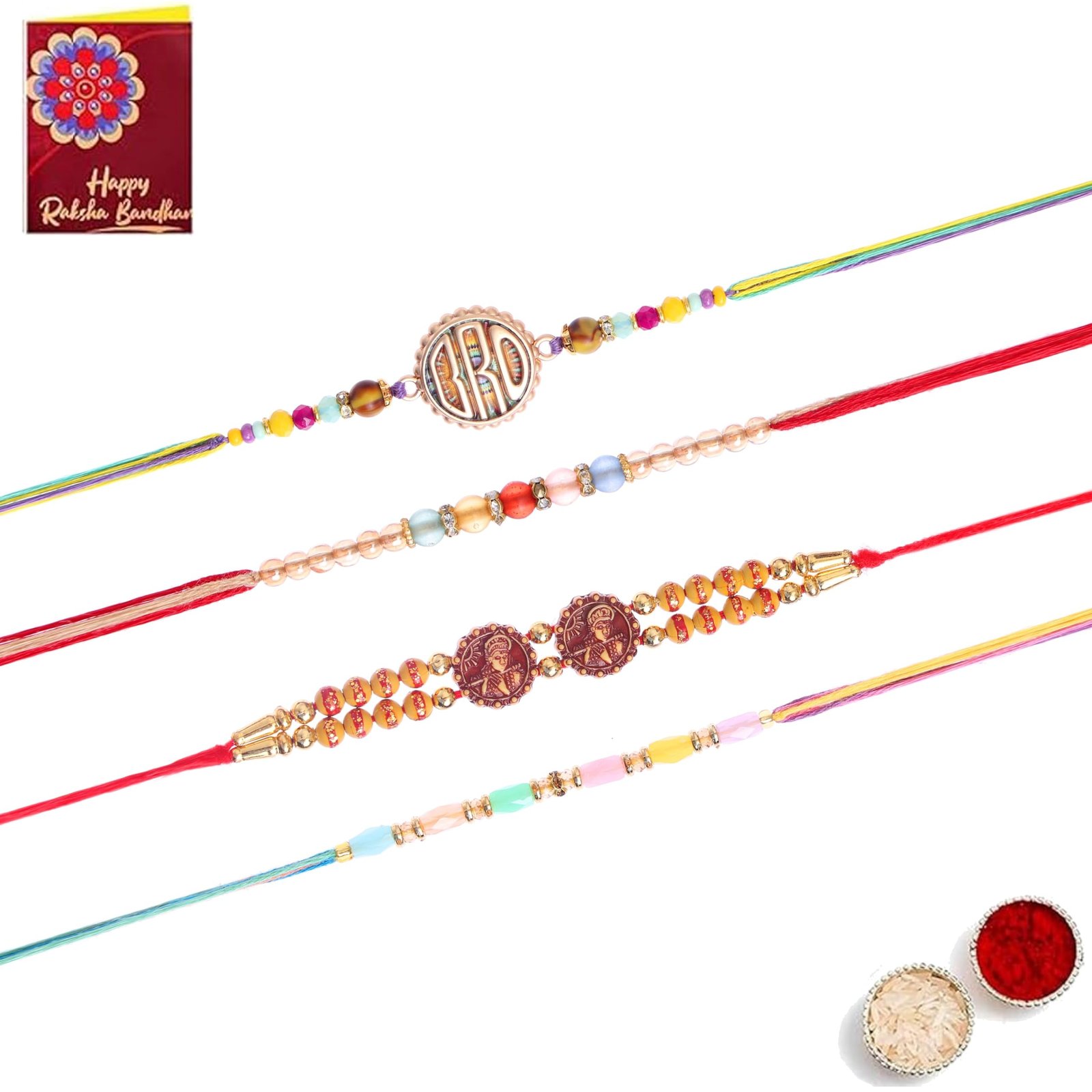 Elegant 4-piece rakhi set, stylish festive design.