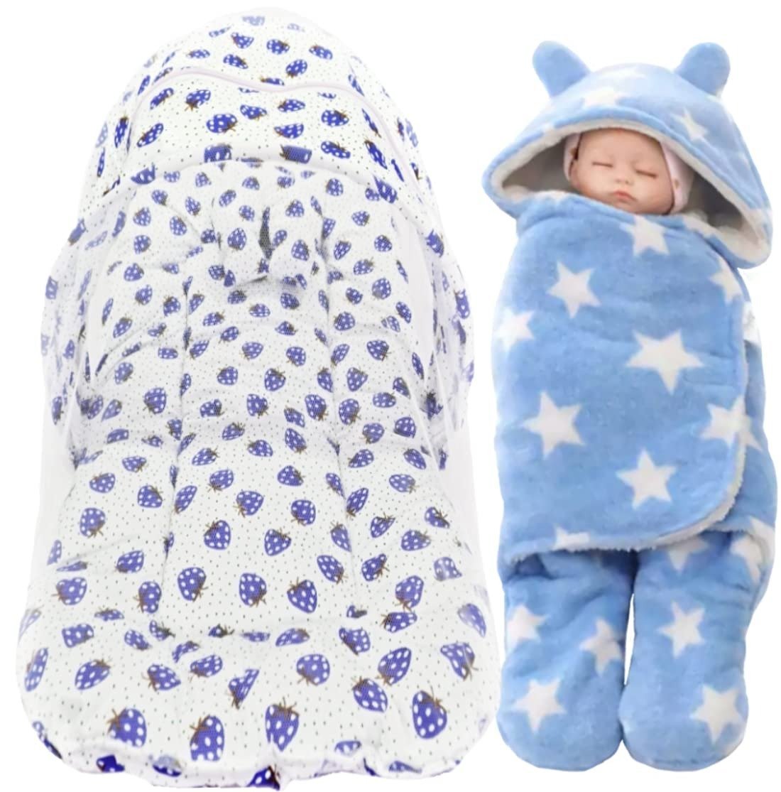 First Kick Baby Bedding Set New Born Combo Pack of Super Soft Wrapper Blanket and Baby Bedding Set with Mosquito Net for Baby (78cm x 45cm, 0-6 Months) Set of 2 Blue Cherry, Stars Blue – Fast Shipping to USA & Canada