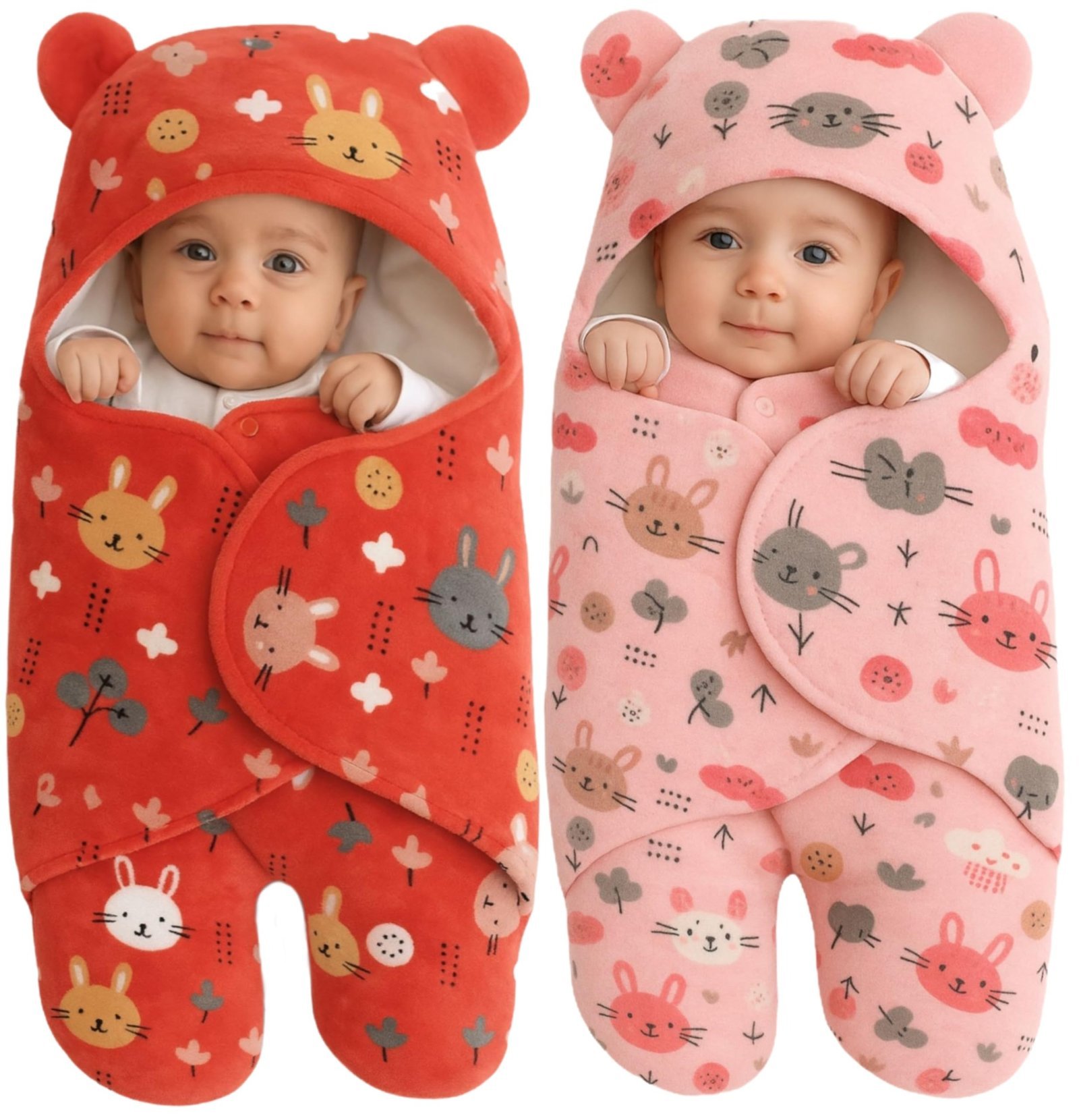 First Kick Baby Blanket New Born Pack of Hooded Printed Swaddle Wrapper Bag Pack of 2 Pcs, 0-6 Months, L 70 cm x B 70 cm – Fast Shipping to USA & Canada