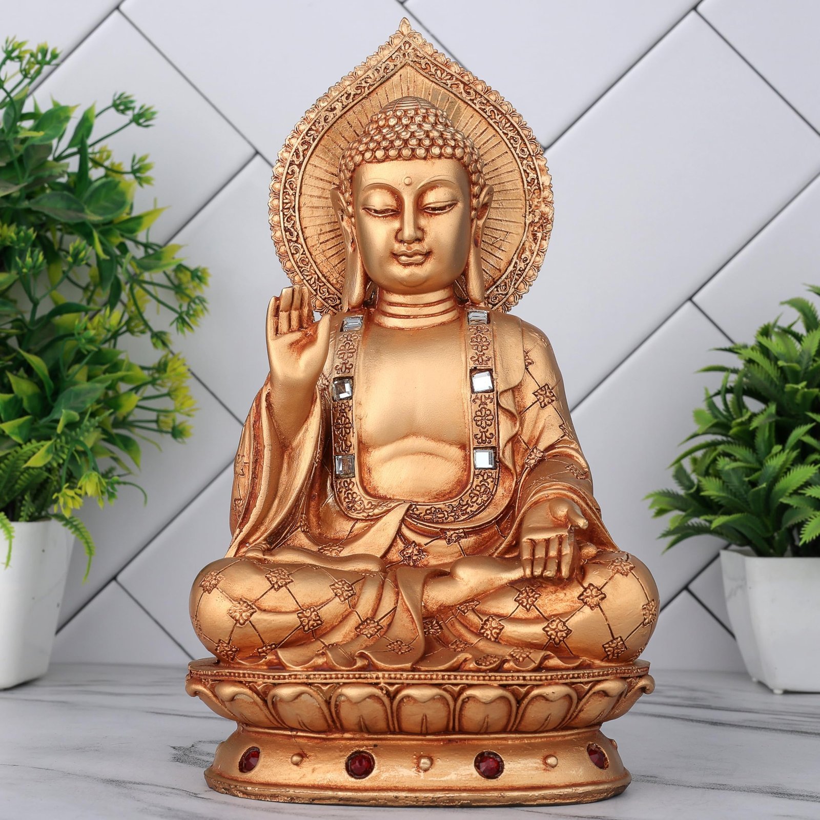 These beautiful lord gautam buddha statues for living room from the house of Global Grabbers on Amazon are a wonderful gifts and very beautiful home decor Items for living room bedroom These buddha show pieces for home decor are made From highest grade polyresin material and is handcrafted by skilled artisans using conventional techniques. Everyone wants perfect peace of mind that’s free from ignorance, greed, hatred and other afflictive states. Buddha Idol as home decoration items are always been a great symbol of peace. So, what could be a better gift or a better option to bring home than the idol of Buddha. This Buddha statue is a perfect piece of art for Home decoration and house warming gifts for new home . Elevate your home and garden Decor with our exquisitely crafted Buddha statue, a perfect symbol of peace and spiritual enlightenment. this detailed Buddha statue is designed to bring serenity and mindfulness to any space. Whether placed in your living room, meditation room, office, or garden, its intricate hand-carved features and serene expression will create a calming atmosphere. Ideal for yoga studios and as a thoughtful anniversary gifts for parents wife or housewarming these Buddha statues not only enhances aesthetics but also promotes relaxation and positive energy. Embrace tranquility and spiritual growth by adding this elegant Buddha statue to your new home decor collection today.