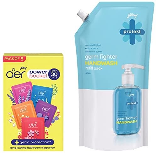 Godrej Aer Power Pocket | Assorted Pack of 5 (50g) & Godrej Protekt Germ Fighter Handwash Refill Pack | Aqua | Germ Protection & Soft on Hands – 725ml – Fast Shipping to USA & Canada