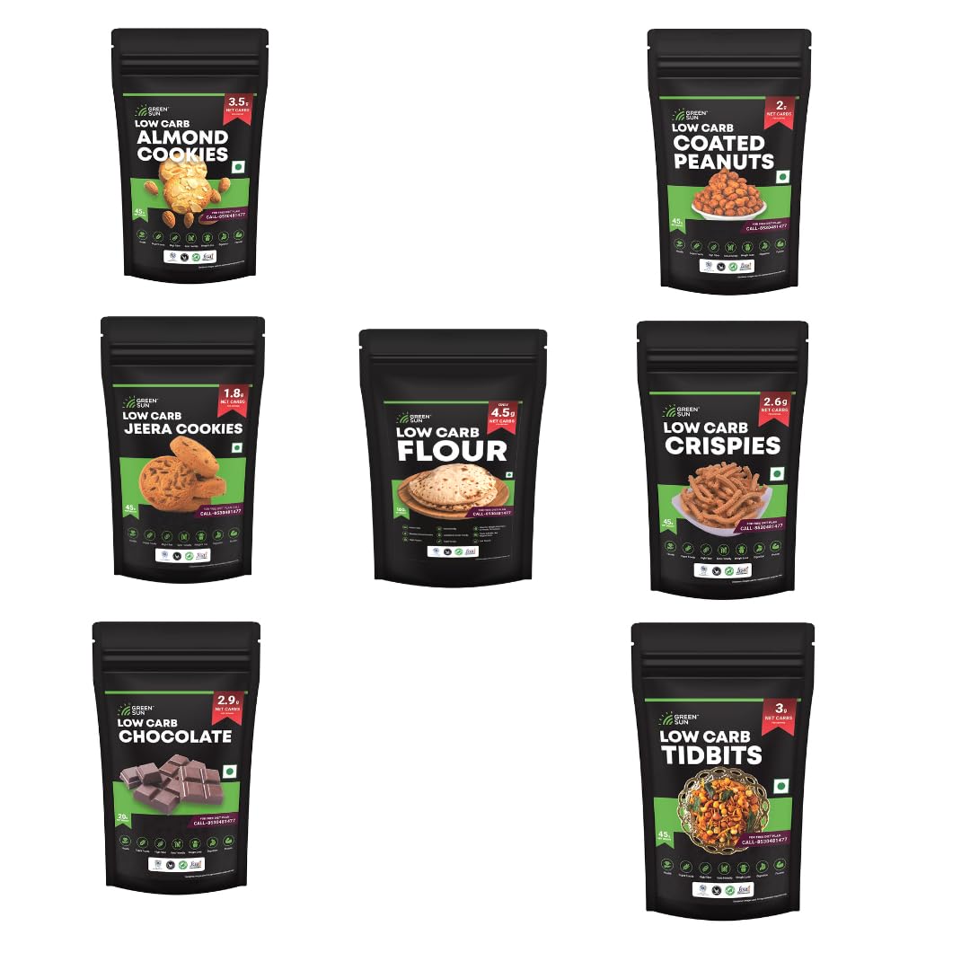 - DIVERSE FLAVOR SELECTION: Green Sun Low Carb offerings feature a variety of flavors, including spicy, savory, and delightful snacking choices such as Low Carb Crispies, Tid-Bits, and Coated Peanuts. Indulge in scrumptious baked treats like Jeera Biscuits and Almond Cookies, and satisfy your sweet cravings with our Zero Sugar Low Carb Chocolate, ensuring your diet remains both healthy and enjoyable.