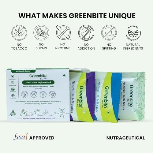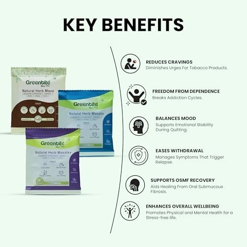 • Greenbite Herbal Granules: This distinctive formula combines ten pure herbal extracts, expertly crafted to naturally and safely support the reduction of tobacco, gutkha, and pan masala cravings.
