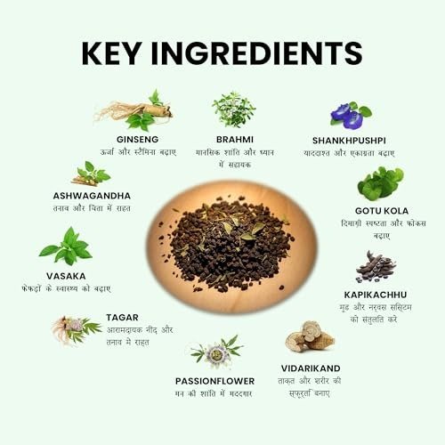 • Scientifically Formulated Herbal Blend: Infused with 10 potent botanical extracts such as Ashwagandha, Ginseng, Brahmi, Shankhpushpi, Vasaka, Passionflower, Gotu Kola, Kapikachhu, Tagar, and Vidarikand, offering comprehensive wellness support.