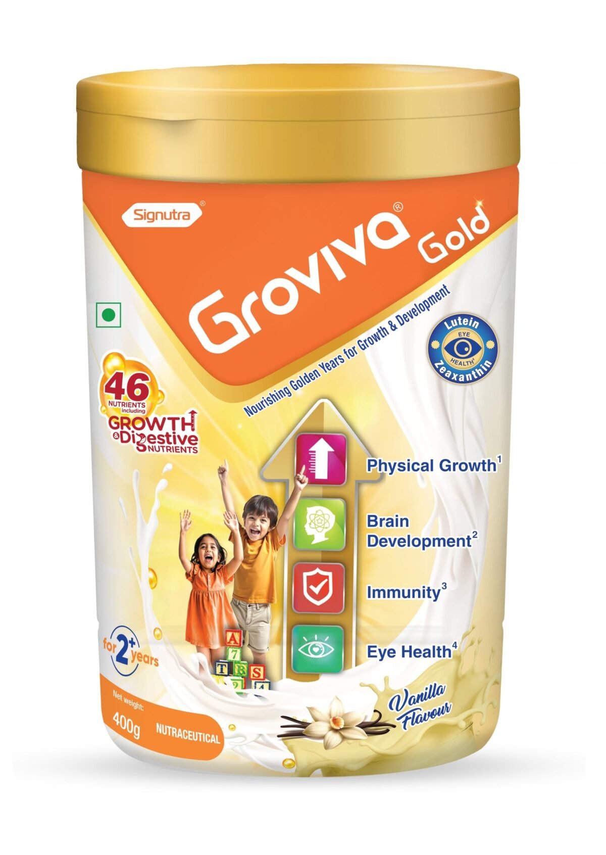 - GROVIVA GOLD is enriched with 46 essential nutrients and is loaded with a distinctive blend of growth and digestive elements. This formulation not only promotes physical development but also aids in cognitive growth, boosts immunity, and tackles the pressing concern of eye health in todays children, who are increasingly exposed to screens.