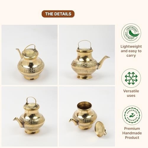 Habere India-All the Cultures Fabricating India Traditional Brass Pooja Kalash | Kerala Kindi, Lota with Spout & Gangajal Lota | Puja Accessories & Brass Vessels for Home (Design01: L13 x W9 x H10 cm) – Fast Shipping to USA & Canada