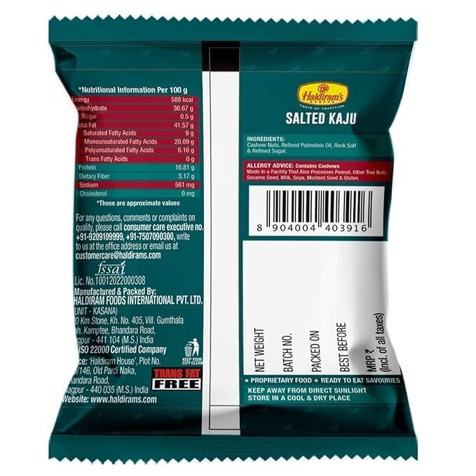 - Three packs of Nagpur salted cashews (35 gm each) and three packs of masala cashews (35 gm each)