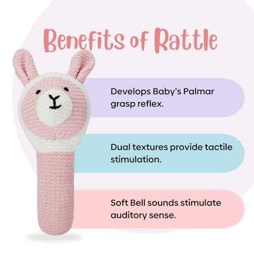 - Gentle & Infant-Friendly Fabric: Made entirely from cotton and filled with polyfibre, this pink rattle is suitable for newborns and toddlers up to 2 years old. The plush, knitted yarn feels soothing against sensitive skin and is perfectly sized for tiny hands to grasp and rattle. With a length of 15cm, it ensures both comfort and security for your little one. Sold as a single unit (1 piece), it makes a thoughtful gift or a delightful addition to daily playtime.