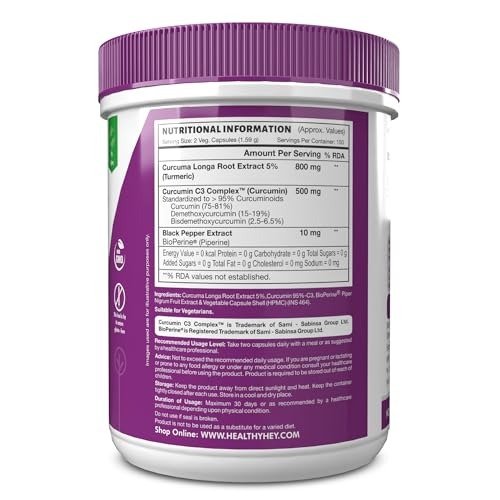 • Maximum Strength Turmeric Capsules Fortified with Bioperine: HealthyHey Curcumin Delivers 1310mg of Turmeric Curcumin, Featuring 95% Standardized Curcuminoids in Each Serving (Ultimate Potency) Alongside 10mg of Bioperine (Black Pepper) to Boost Absorption and Bioavailability.