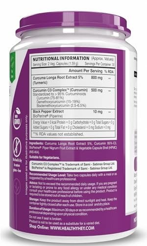 - Maximum Strength Turmeric Capsules Fortified with Bioperine: HealthyHey Curcumin Offers 1310mg of Turmeric Curcumin, Featuring 95% Standardized Curcuminoids in Each Serving (Ultimate Potency) Alongside 10mg of Bioperine (Black Pepper) to Boost Absorption and Bioavailability.