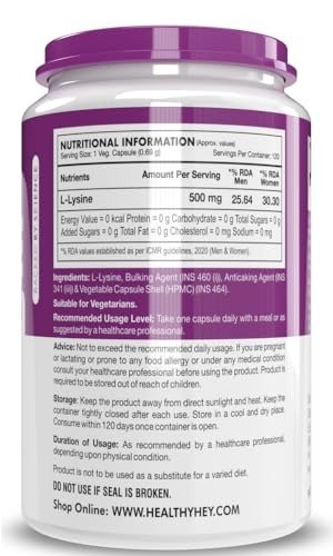 HealthyHey Nutrition L-Lysine 120 Vegetable Capsules – Fast Shipping to USA