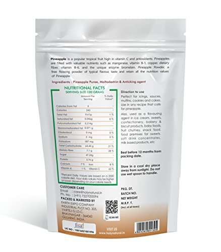 - Real Taste & Aroma ? Holy Natural Spray Dried Pineapple Powder is No added sugar, colour, flavour or preservative used, even then all real characteristics, aroma, taste are intact. Rich in taste. Pure & Natural, Vegan, Gluten free.