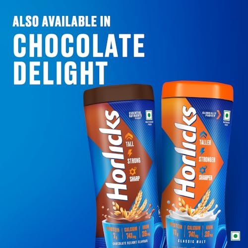 Horlicks is the leading nutrition beverage in India, designed to help children grow Taller, Stronger, and Sharper. It is enriched with 27 essential nutrients, including Folic Acid, Vitamin D, Protein, Calcium, and Iron, which contribute to both mental development and physical strength. Additionally, it contains Zinc and Vitamin E to enhance immunity. Horlicks is also available in a delightful Chocolate flavor.
