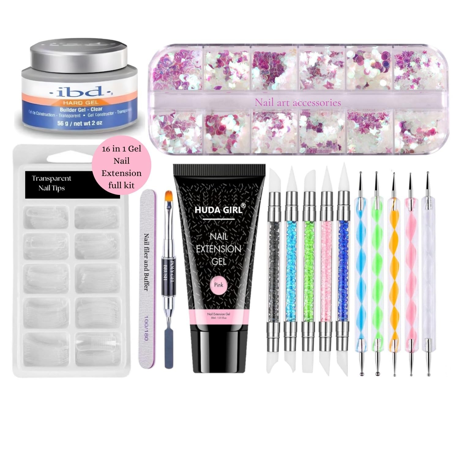 - All-in-One 16-Piece Set: Contains all the essentials for a complete nail extension and artistry journey, featuring gels, tools, and embellishments.