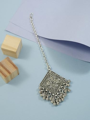 Add a touch of tradition and elegance to your Navratri look with the I Jewels Navratri Special Ethnic Silver Oxidized Mathapatti. Thoughtfully handcrafted, this beautiful headpiece blends timeless design with a modern twist, making it perfect for women and girls alike. Made from durable silver oxidized metal, it features intricate detailing and delicate Ghungroo embellishments that create a gentle, musical jingle as you move-adding to the festive spirit.