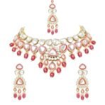 Enhance your classic appearance with the accompanying maang tikka. Its intricate design, paired with the luminous Kundan and pearl accents, infuses a sense of elegance into your hairstyle, ensuring you stand out at any occasion. The choker necklace boasts a bold design that elegantly wraps around the neck, serving as a captivating centerpiece. The gold-plated finish imparts an air of opulence, making it an ideal adornment for weddings, festivals, or any memorable celebration.