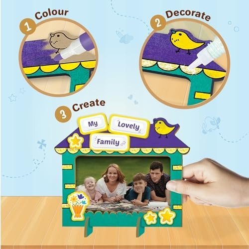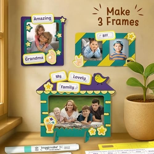 With this DIY photo frame kit, your child can unleash their imagination and honor family connections-a charming activity crafted for children aged 5 and up, where they can design their own personalized photo frames. The comprehensive set features 3 durable MDF wooden frames, 3 vibrant acrylic markers, 1 tube of glitter glue, and over 45 foam stickers, including special family-themed stickers such as Mom, Dad, Grandma, and Brother. This allows kids to decorate each frame uniquely for their loved ones. Ideal for craft sessions, festive decorations, room adornment, handmade presents, or party favors, this kit combines enjoyment with learning by encouraging children to express their feelings, develop storytelling abilities, and deepen their understanding of relationships. Constructed from non-toxic, child-friendly materials, the kit guarantees a safe and pleasant crafting experience. It makes a thoughtful birthday present or return gift for children aged 6-10, and is especially suitable for 5-year-old girls, inspiring both creativity and emotional bonding. Proudly manufactured in India by Imagimake, a trusted brand known for producing premium educational toys, art and craft kits, puzzles, and 3D model sets that foster well-rounded child development and make learning engaging and fun.