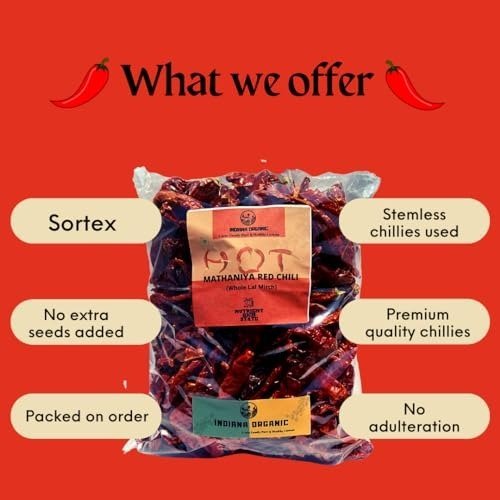 Indiana Organic Mathania Whole Red Chili – 400 gram | Rajasthani Mathania Whole Mirch, Sabut lal mirch, Stemless, 400 gram (vaccum packed air tight) – Fast Shipping to USA & Canada