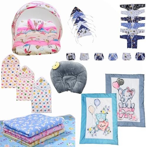 • Contents of the Pack: 1 mattress with net, 6 shirts, 6 caps, 6 nappies, 3 blankets, 2 digital gadi, and 4 sheets.