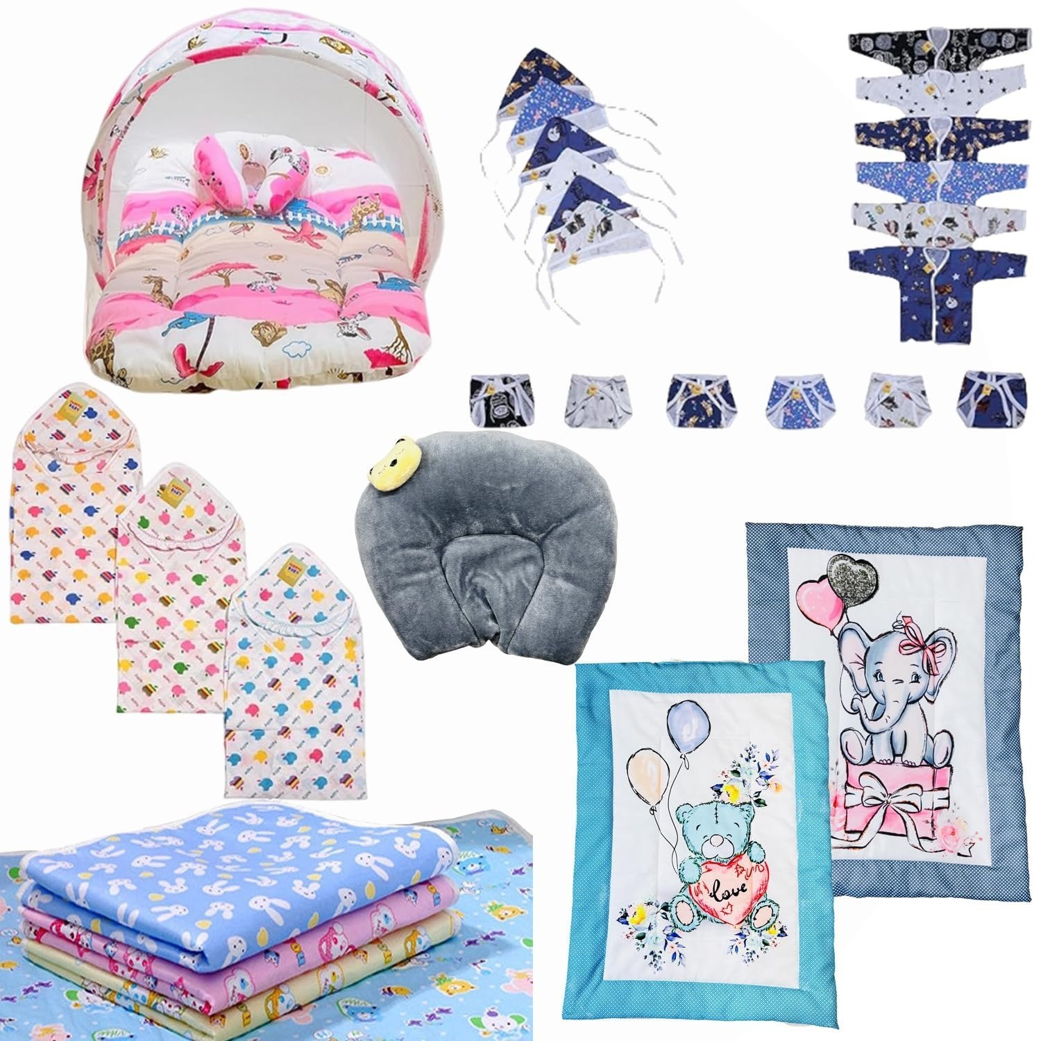 The set includes: 1 mattress with net, 6 shirts, 6 caps, 6 nappies, 3 blankets, 2 digital mattresses, and 4 sheets.