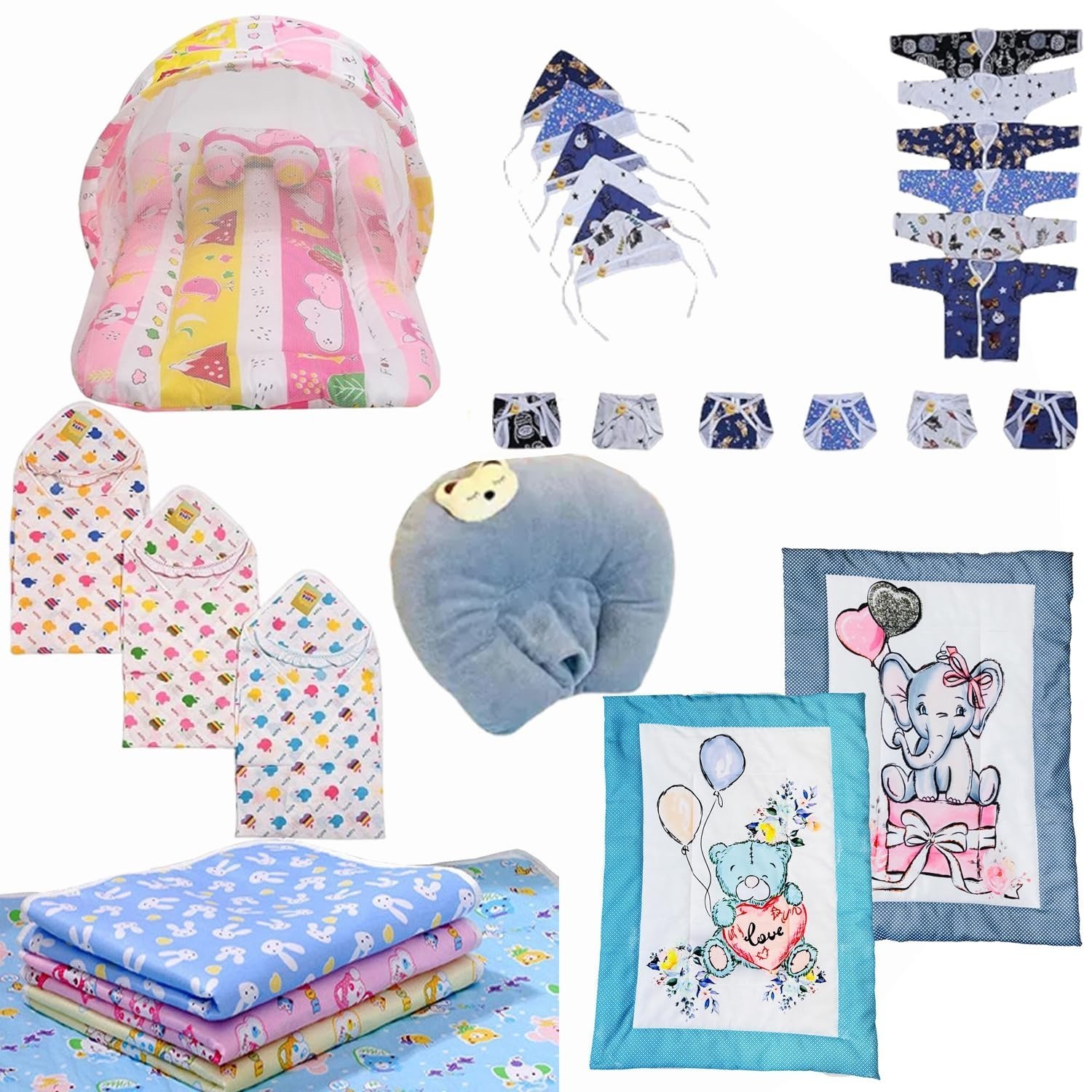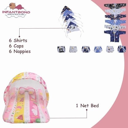 - The set includes: 1 mattress with net, 6 shirts, 6 caps, 6 nappies, 3 blankets, 2 digital pads, and 4 sheets.