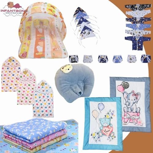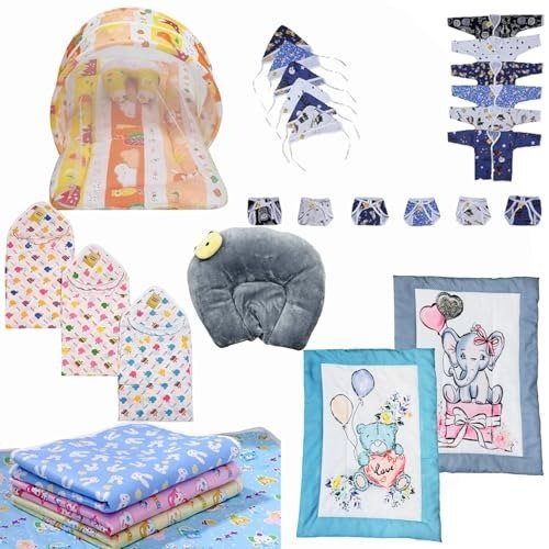 The set includes: 1 mattress with net, 6 shirts, 6 caps, 6 nappies, 3 blankets, 2 digital pillows, and 4 plastic sheets.