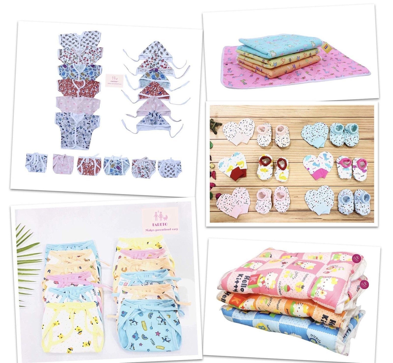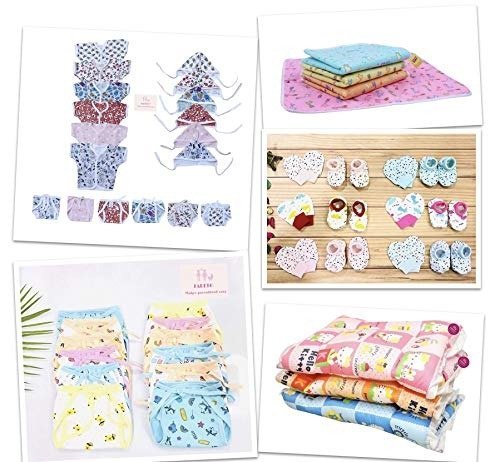 • Set Includes: 6 front-opening shirts | 6 tie-up caps | 6 tie-on nappies | 6 pairs of mittens | 6 pairs of socks | 4 waterproof mats | 3 baby beds | 12 hosiery nappies. Grand Total: 49 items.