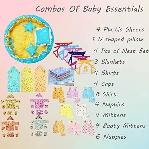- Set Includes: 4 Front-Opening Shirts | 4 Diapers | 4 Hats | 4 Sets of Mittens | 4 Pairs of Booties | 4 Waterproof Mats | 3 Single-Layer Wrappers | 8 Front-Open Jhablas | 8 Coordinated Diapers | 6 Hosiery Diapers | 4 Nest Pieces (Total: 56 Items)