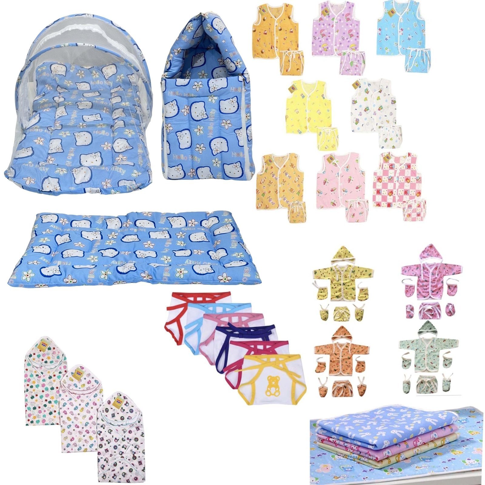 - Set Includes: 4 Front-Opening Shirts | 4 Nappies | 4 Caps | 4 Pairs of Mittens | 4 Pairs of Socks | 4 Waterproof Sheets | 3 Single-Layer Wrappers | 8 Front-Open Jhablas | 8 Coordinated Nappies | 6 Hosiery Nappies | 4 Nest Pieces (Total: 56 Items)