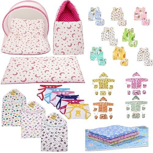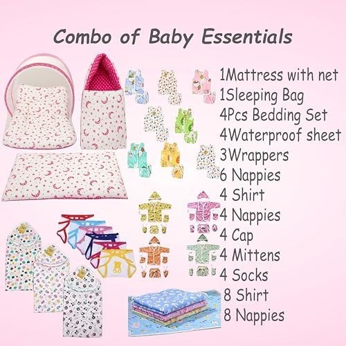 • Set Includes: 4 Front-Opening Shirts | 4 Nappies | 4 Caps | 4 Pairs of Mittens | 4 Pairs of Socks | 4 Waterproof Sheets | 3 Single-Layer Wrappers | 8 Front-Open Jhablas | 8 Coordinated Nappies | 6 Hosiery Nappies | 4 Nest Pieces (Total: 56 Items)