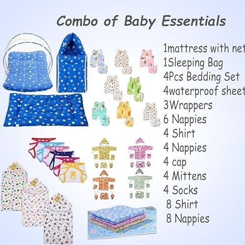 • Set Includes: 4 Front-Opening Shirts | 4 Nappies | 4 Caps | 4 Pairs of Mittens | 4 Pairs of Socks | 4 Waterproof Sheets | 3 Single-Layer Wrappers | 8 Front-Open Jhablas | 8 Coordinated Nappies | 6 Hosiery Nappies | 4 Nest Pieces (Total: 56 Items)