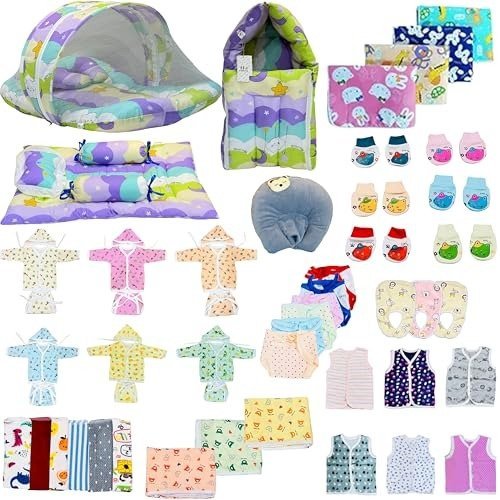 Infantbond by Fareto offers an extensive 60-piece baby essentials combo pack, thoughtfully curated to cater to every need of newborns and new mothers. This all-inclusive hospital kit features a variety of clothing, bedding, and hygiene items, making it ideal for both baby boys and girls. Crafted from soft, breathable cotton, each product is gentle on sensitive skin, ensuring maximum comfort. Whether you?re assembling your maternity hospital bag, searching for a thoughtful newborn gift, or outfitting your baby?s nursery, this comprehensive set provides everything you need.