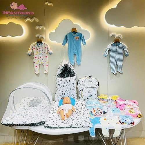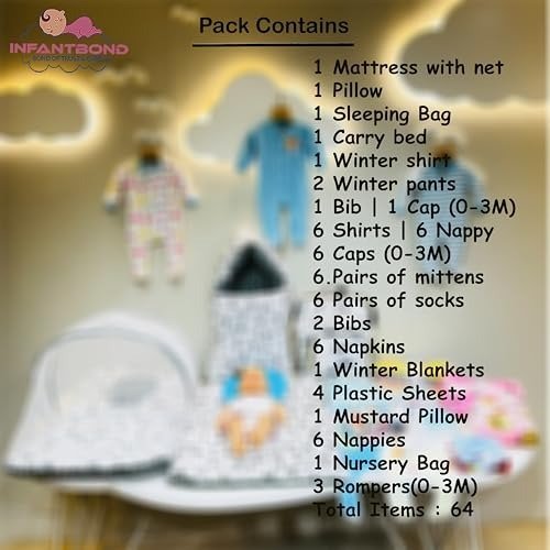 Infantbond?s baby care set offers an all-in-one solution for new parents, designed to keep your newborn warm, comfortable, and secure. The set features a mattress with a protective net, a cosy sleeping bag, a portable carry bed, and a winter shirt to ensure your baby stays snug. It also includes two pairs of winter pants, a bib, a cap (0-3 months), six shirts, six nappies, six caps (0-3 months), six pairs of mittens, six pairs of socks, two bibs, six napkins, a winter blanket, four sheets, a mustard seed pillow, six nappies, a nursery bag, and three rompers (0-3 months). With a total of 64 essential items, this set provides everything necessary for your newborn?s daily care and comfort. Thoughtfully packaged, it makes a perfect gift for expecting parents or a valuable addition to your baby?s essentials.