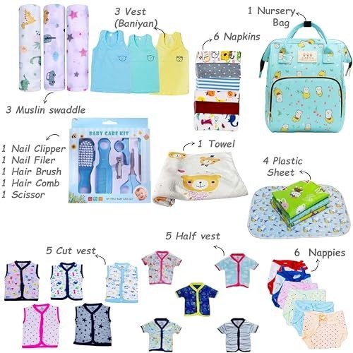 • CLOTHING ESSENTIALS: Includes 6 shirts, 6 diapers, 6 hats, 5 sleeveless vests, 5 half-sleeve vests, and 3 standard vests (baniyans), all designed to fit babies aged 0-3 months.