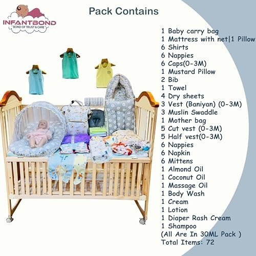 Celebrate your newborn?s arrival with this all-inclusive 72-piece Infantbond care kit, expertly assembled for infants aged 0-6 months. This essential starter set provides a range of comfortable clothing, including 6 shirts, 3 vests, 5 sleeveless vests, and 5 half-sleeve vests, all tailored for babies 0-3 months old. Practical daily necessities are covered with 6 nappies, 6 napkins, and 6 pairs of mittens, ensuring your little one stays clean and snug. For added comfort, the kit features a mattress with a protective net and 3 soft muslin swaddles. Outings are made easier with a dedicated baby carry bag and a spacious mother?s bag for organised storage. Baby?s skincare is well-catered for with 30ml bottles of body wash, lotion, cream, shampoo, and diaper rash cream, along with nourishing almond, coconut, and massage oils for gentle pampering. The set is rounded out with 4 absorbent dry sheets, 2 bibs, and a towel, making it a thoughtful and practical gift for new parents.