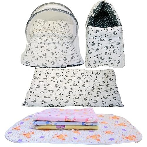 - MATTRESS WITH NET: Shields your baby from mosquitoes and insects | SLEEPING BAG: Convenient for carrying your baby comfortably | BEDDING SET: Ensures restful and peaceful sleep