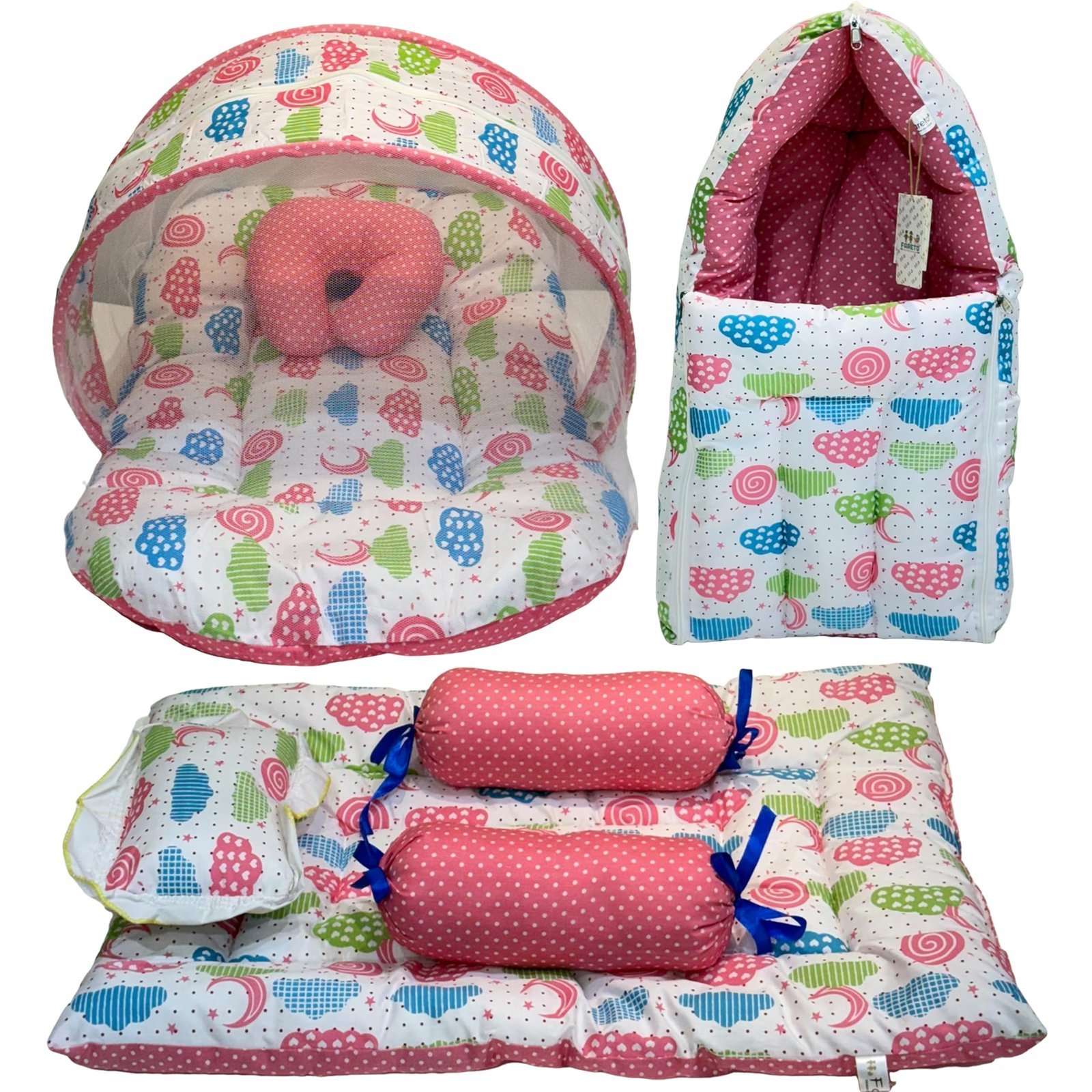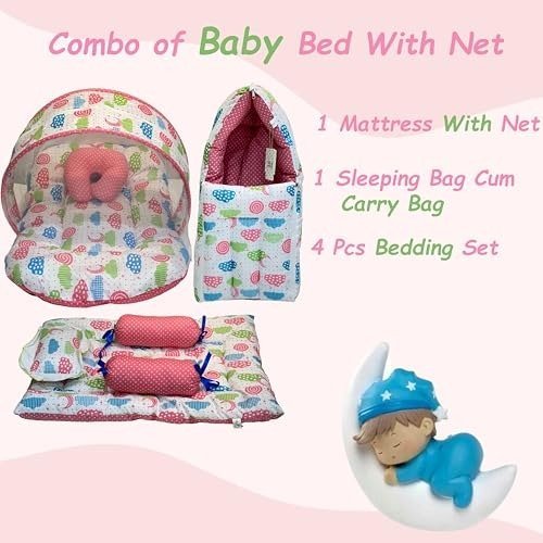 Infantbond Baby Mattress with Net & 4 Pcs Bedding Set (Peach Spiral) ? Fast Shipping to USA & Canada