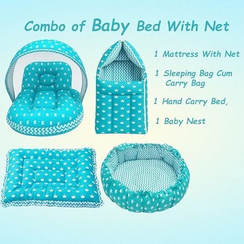 • Included in the pack: 1 baby mattress with net, 1 baby carry bag, 1 nest with two star-shaped cushions, and 1 portable hand carry bed. Total number of items: 4.