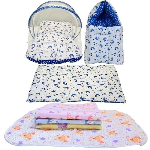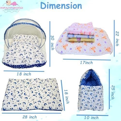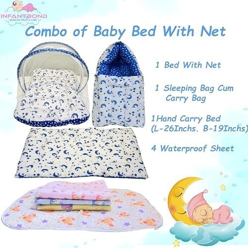 Infantbond Combo Baby Bed with Net & 4 Waterproof Sheets (Moon Blue) ? Fast Shipping to USA & Canada