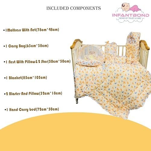 - Set Includes: 1 baby mattress with net and pillow, 1 baby carry bag, 1 nest with 2 star-shaped cushions and 1 pillow, 1 blanket, 1 bolster set, and 1 portable hand carry bed. Total number of items: 12.