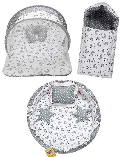 - Included in the pack: 1 reversible baby nest, 2 star-shaped cushions, 1 mattress with mosquito net, and 1 carrying bag.