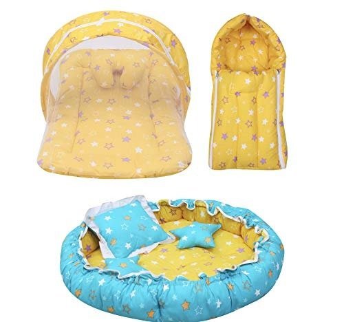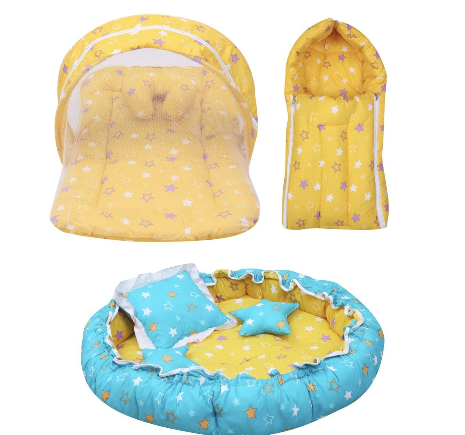 - Included in the pack: 1 reversible baby nest, 2 star-shaped cushions, 1 mattress with net, and 1 carry bag.